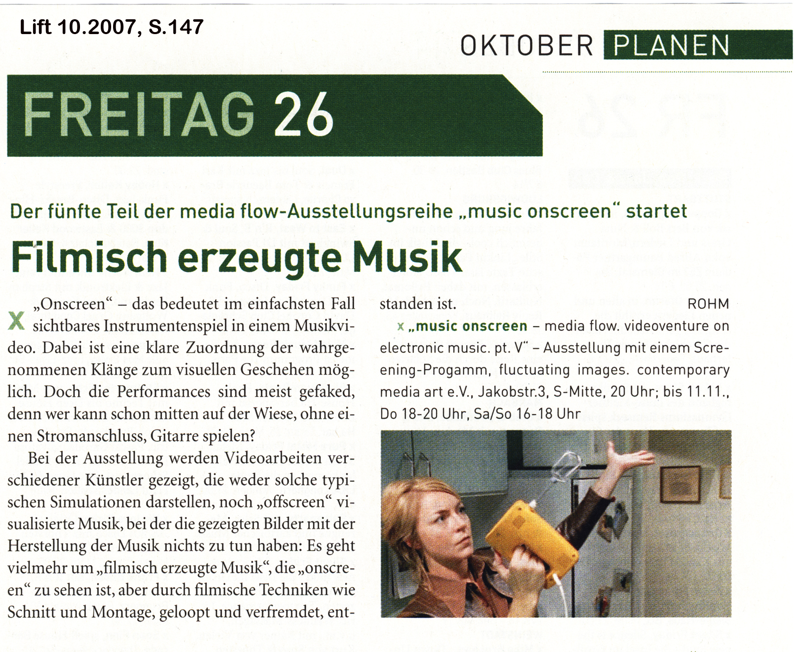 Der fünfte Teil der media flow-Ausstellungsreihe, „music onscreen“, widmet sich Musikvisualisierungen mit onscreen-Musik und Einarbeitung geschnittenen Klanges. „Onscreen“ meint dabei, dass eine kausale Zuordnung der ertönenden Klänge zum visuellen Geschehen möglich ist. Der einfachste Fall ist sichtbares Instrumentspiel. Hierbei kann die Klangerzeugung vom Betrachter visuell an das Geschehen beim Instrumentspiel gebunden werden.